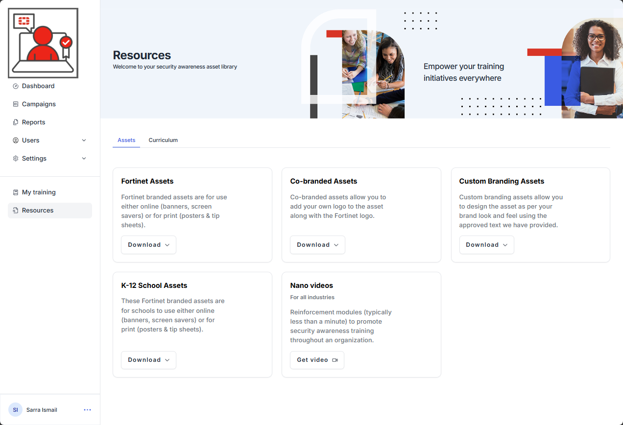 There are two tabs on the Assets navigation menu item: Communication resource and Security awareness curriculum: