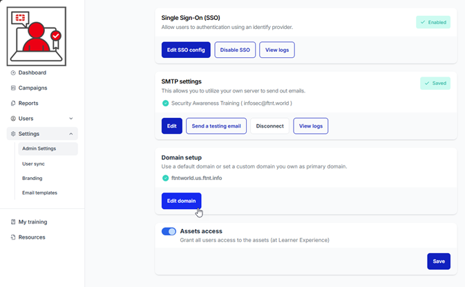 You may edit this custom domain after initialization. This domain will be the url sent to and used by your learners when they are sent training invitations. It is the url they will use when logging in to the system in order to complete training campaigns.