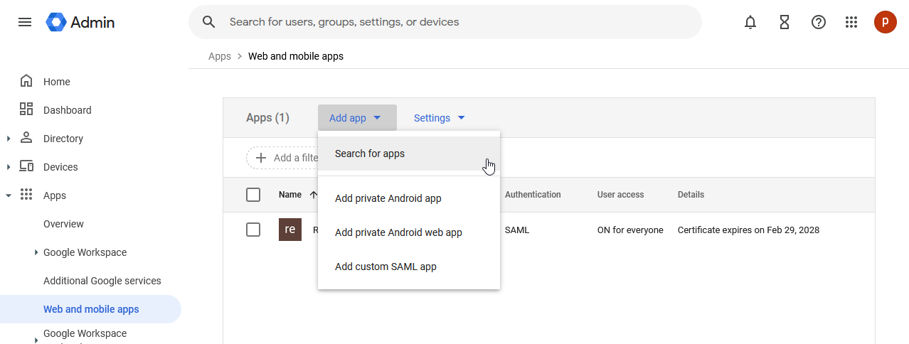 3.) From the Web and mobile apps page, select the Add app drop down, then select Search for apps: