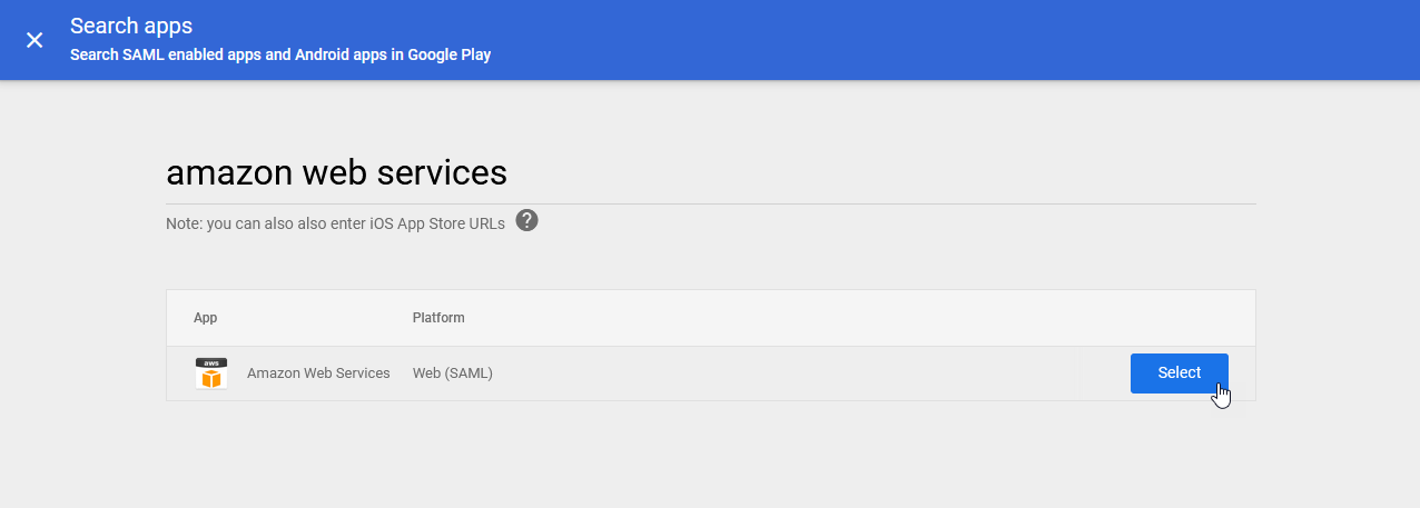 4.) In the Search apps dialogue, enter: "amazon web services". Once the app is found, click on the Select button: