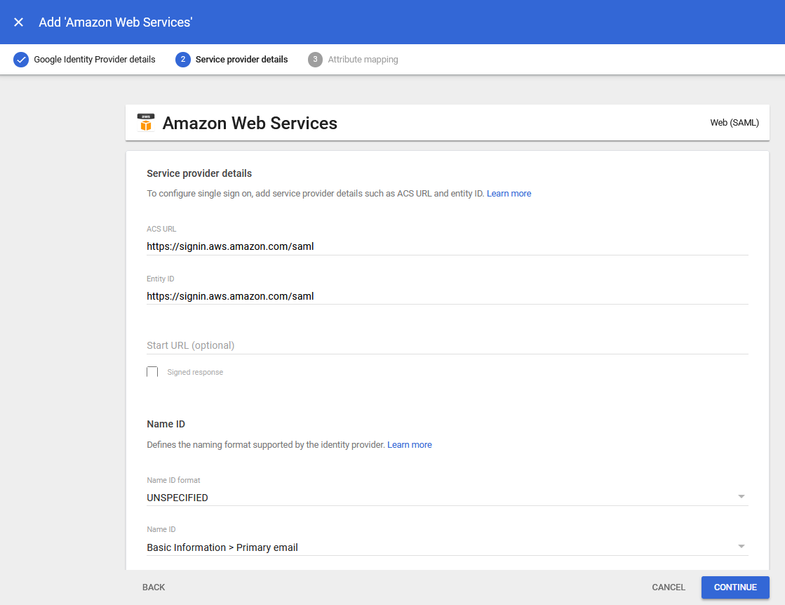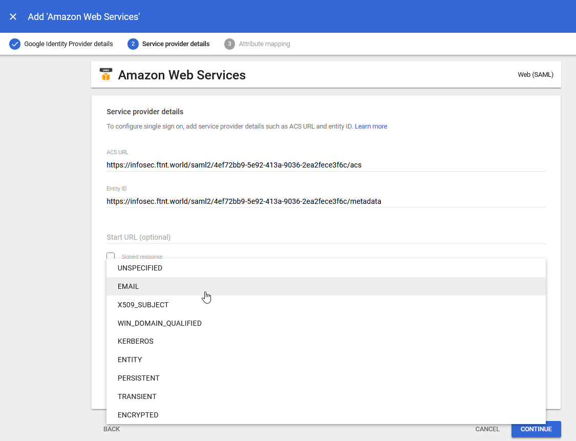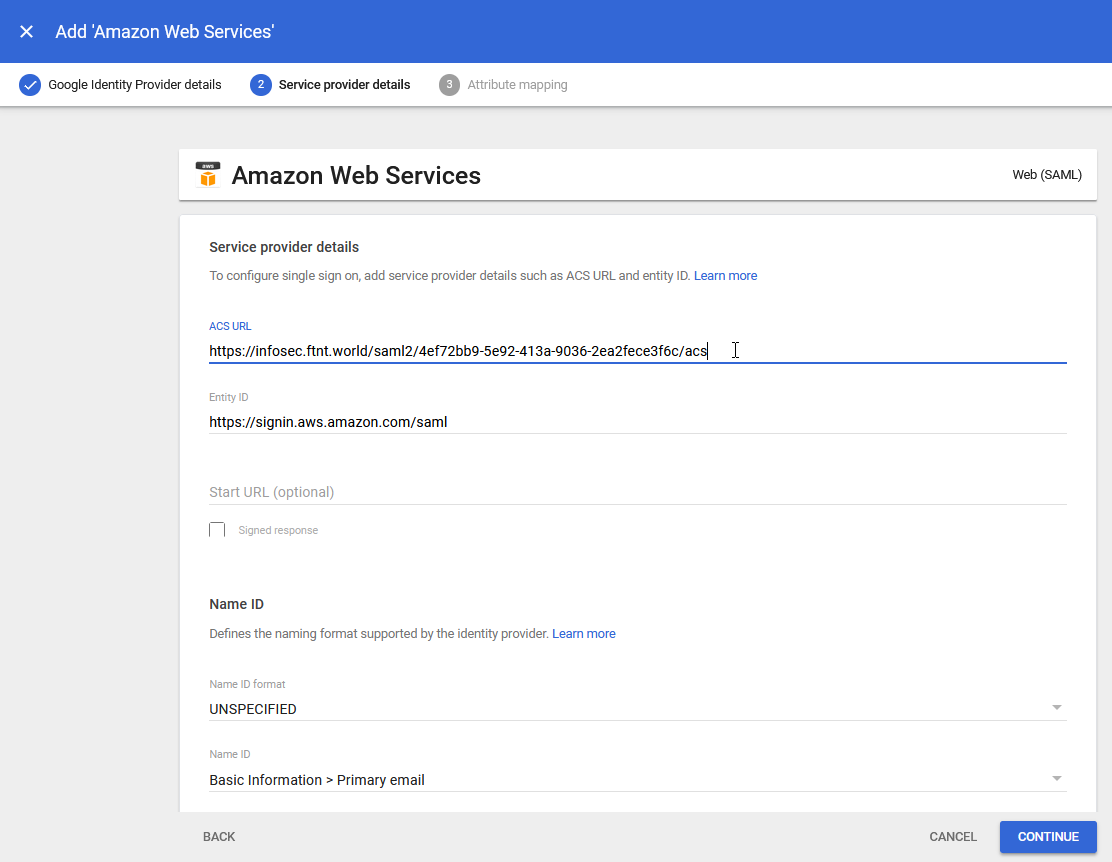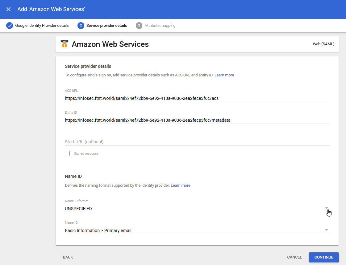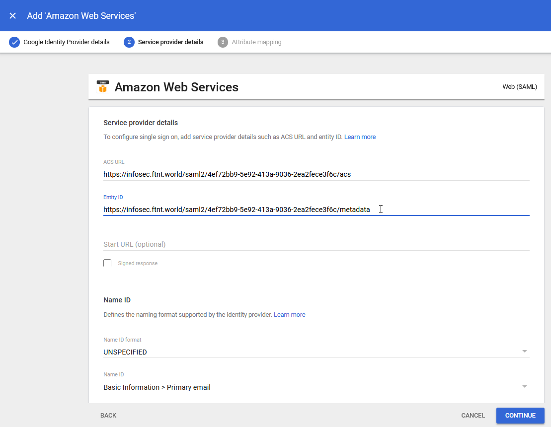 10.) Ensure that the Name ID field is displaying Basic Information > Primary email and click the CONTINUE button: