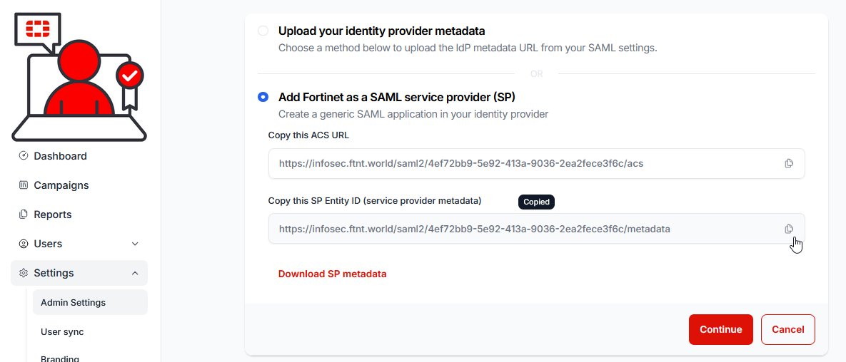 12.) Return to the Fortinet Security Awareness and Training Service console and select the Continue button: