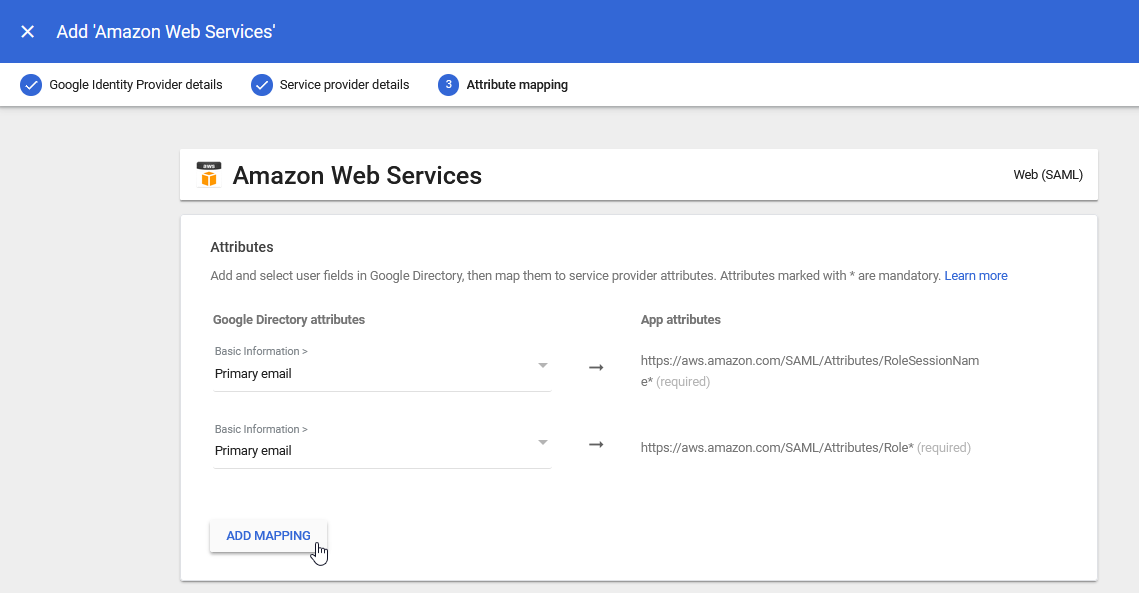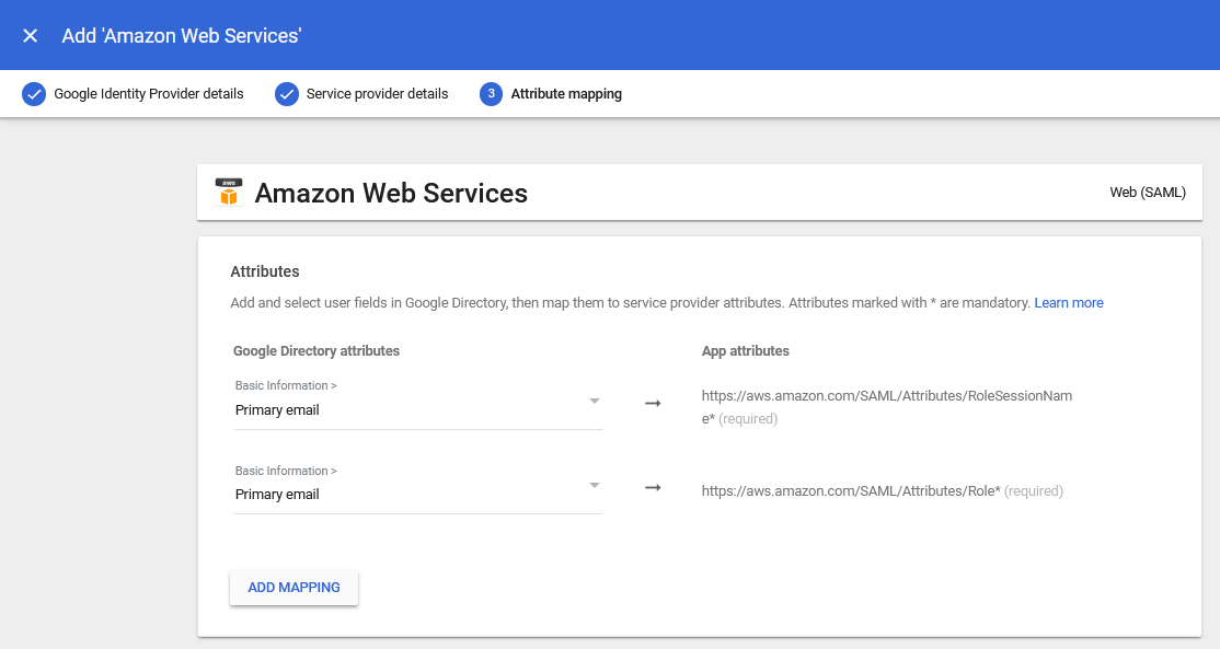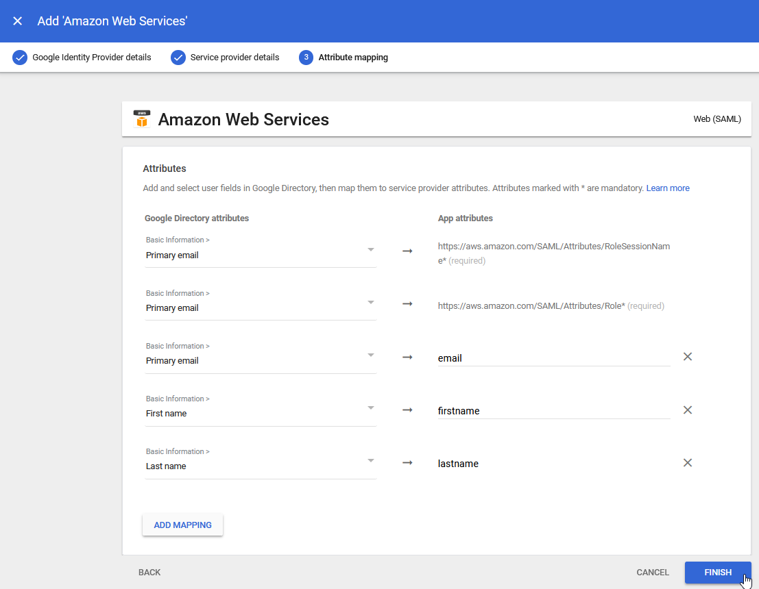 12.) Add attribute mappings as you entered them in the FortiSATS. These must match and be mapped to the Google Directory Attributes for Primary Email, First Name and Last Name: