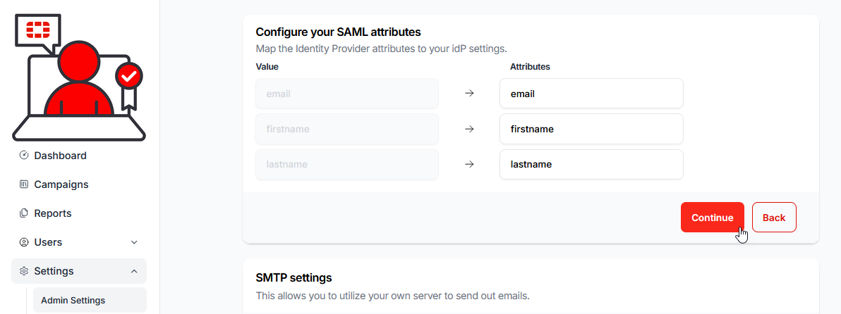 13.) Enter the values you wish to use for the Attributes, in the Attributes fields of the Configure your SAML attributes section (you may use the exact same values as the example, i.e.: email, firstname and lastname).