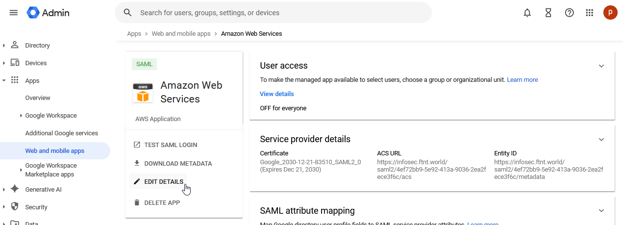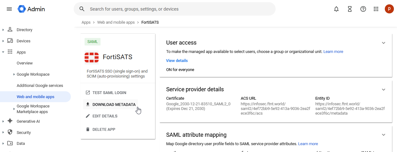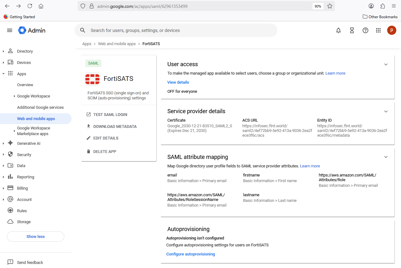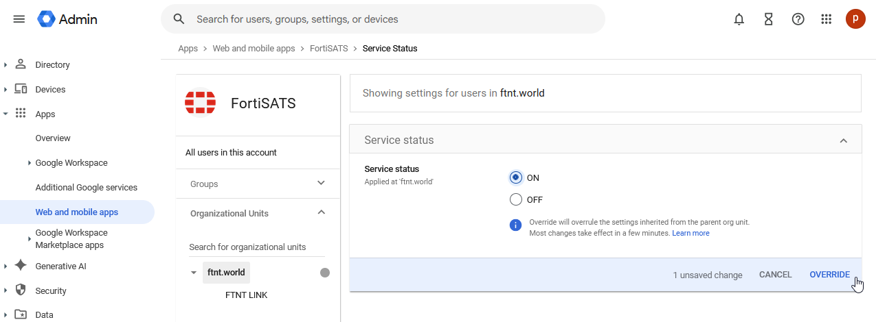 | Before following these steps, ensure you have configured and verified your custom domain: Domain setup (Premium level service) For this operation, you must be logged in to the Google Admin Console as well as the FortiSATS admin console (as tenant administrator). |