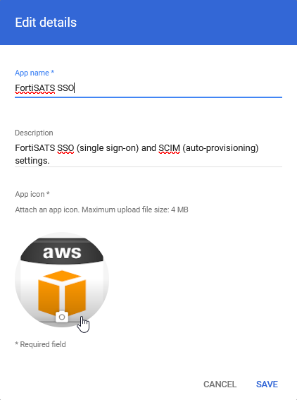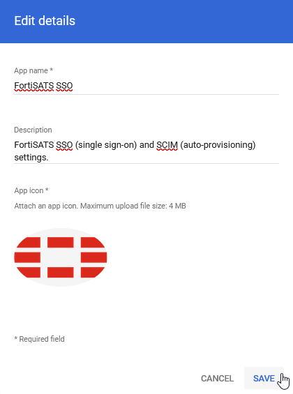 App icon: You can also download the attached Fortinet icon from this KB. Then, click on the app icon and configuration screen and set the new app icon: