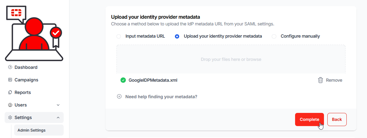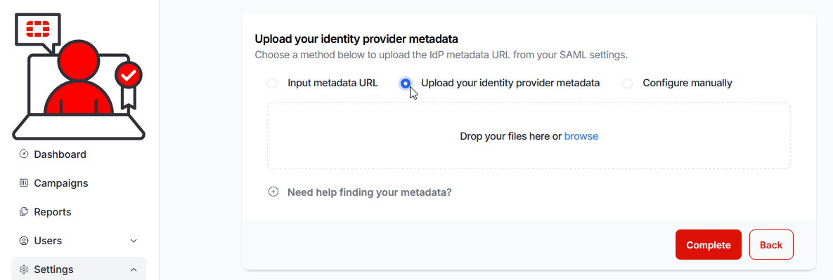 21.) Return to the Fortinet Security Awareness and Training Service console and select the Upload your Identity Provider Metadata option button: