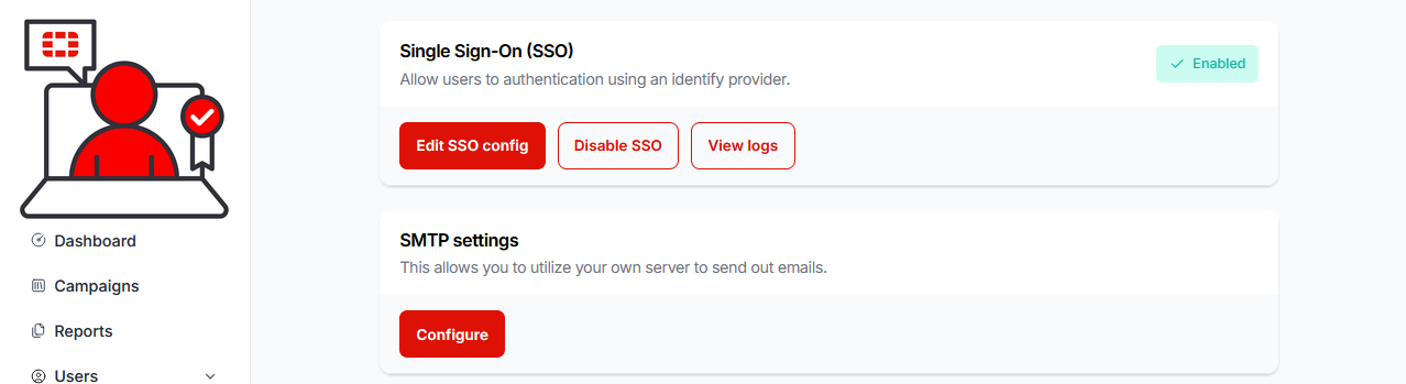 8.) Select the Settings dropdown from the navigation menu, then select the Admin Settings sub-menu item. Now select the Configure button in the Single Sign-On (SSO) section: