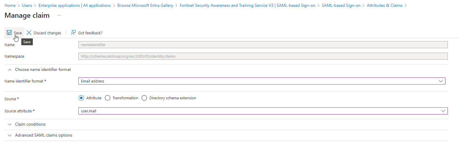 25.) Return to the Microsoft Entra admin center tab in your browser and create the three claims using the values you specified in the previous step. For the first claim, pupulate the Name value matching above, in this example, Email. Then map the source attribute to user.mail and save the entry:
