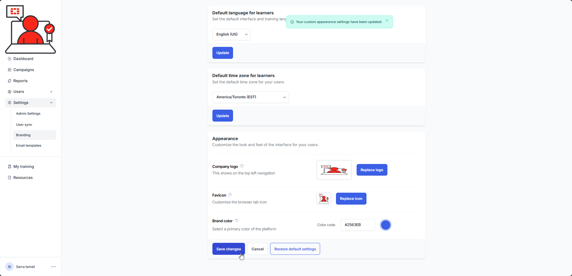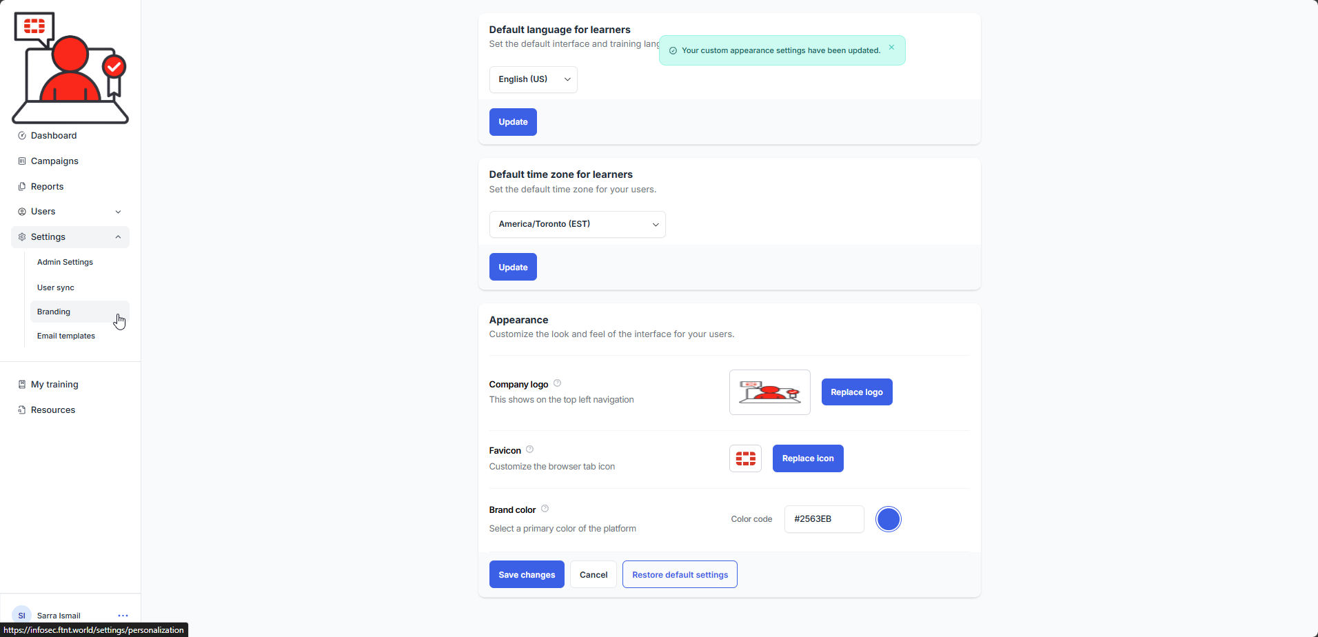 4). Select the Save changes button. The favicon logo is updated and a confirmation message is displayed: