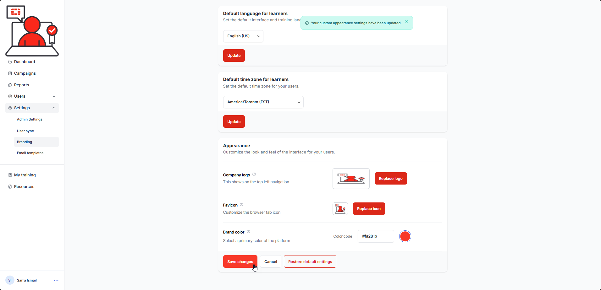 2.) Scroll down to the Appearance section and modify the Color code field to represent the hex code for the desired highlight color. Select the Save changes button. The brand color is updated and a confirmation message is displayed: