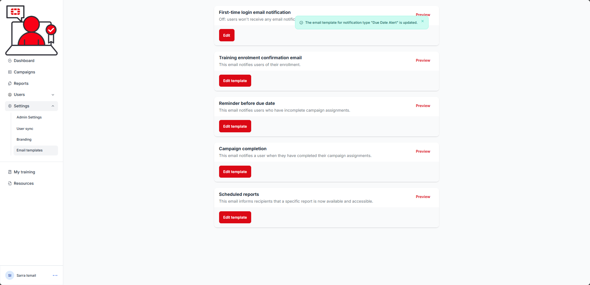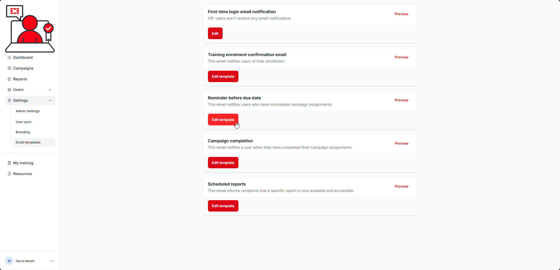 1.) Select Settings from the navigation menu, then select the Email templates sub-menu item. The Email templates page is displayed: