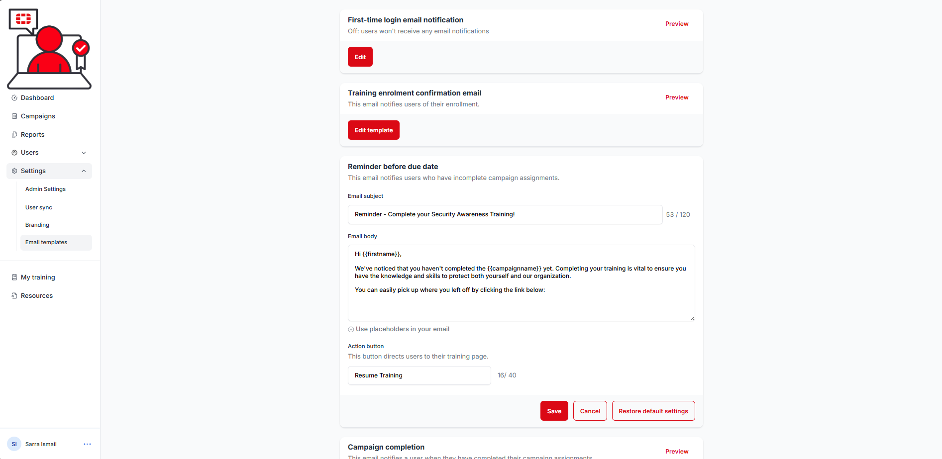 5.) Customize the Action button text as desired. This is the text that will appear on the button within the email that redirects the learner to set their initial password.