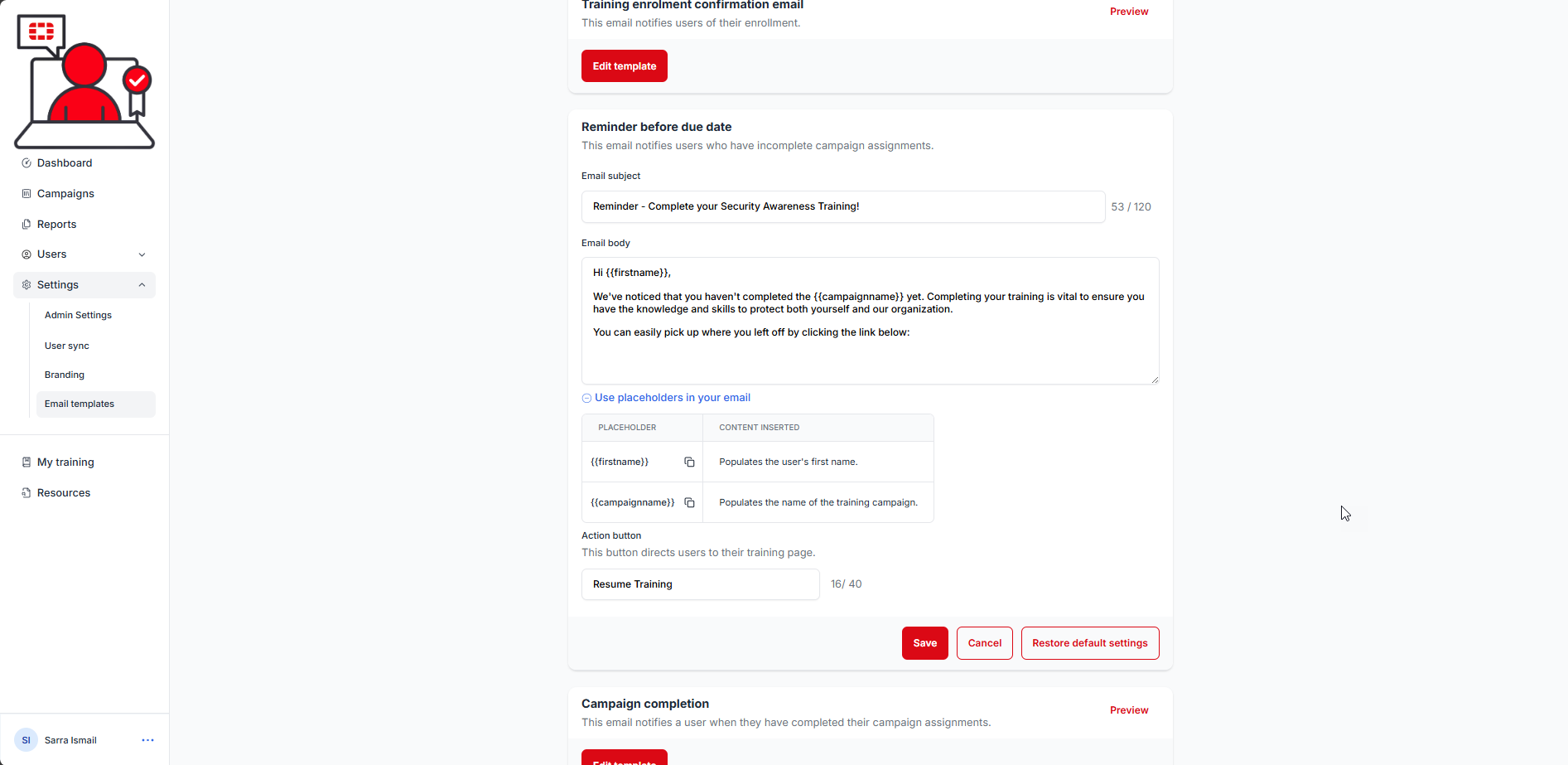 4.) Customize the content of the Email body as desired. You may wish to include a support number and/or email, additional information on why the training is being assigned etc. You an also use any of the provided placeholders in the email body. To view the placeholder values, click the + Use placeholders in your email button below the body to expand the list of available placeholders: