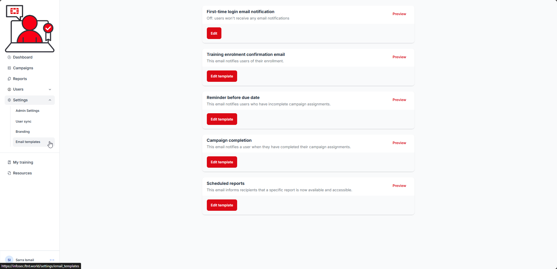 1.)  Select Settings from the navigation menu, then select the Email templates sub-menu item. The Email templates page is displayed: