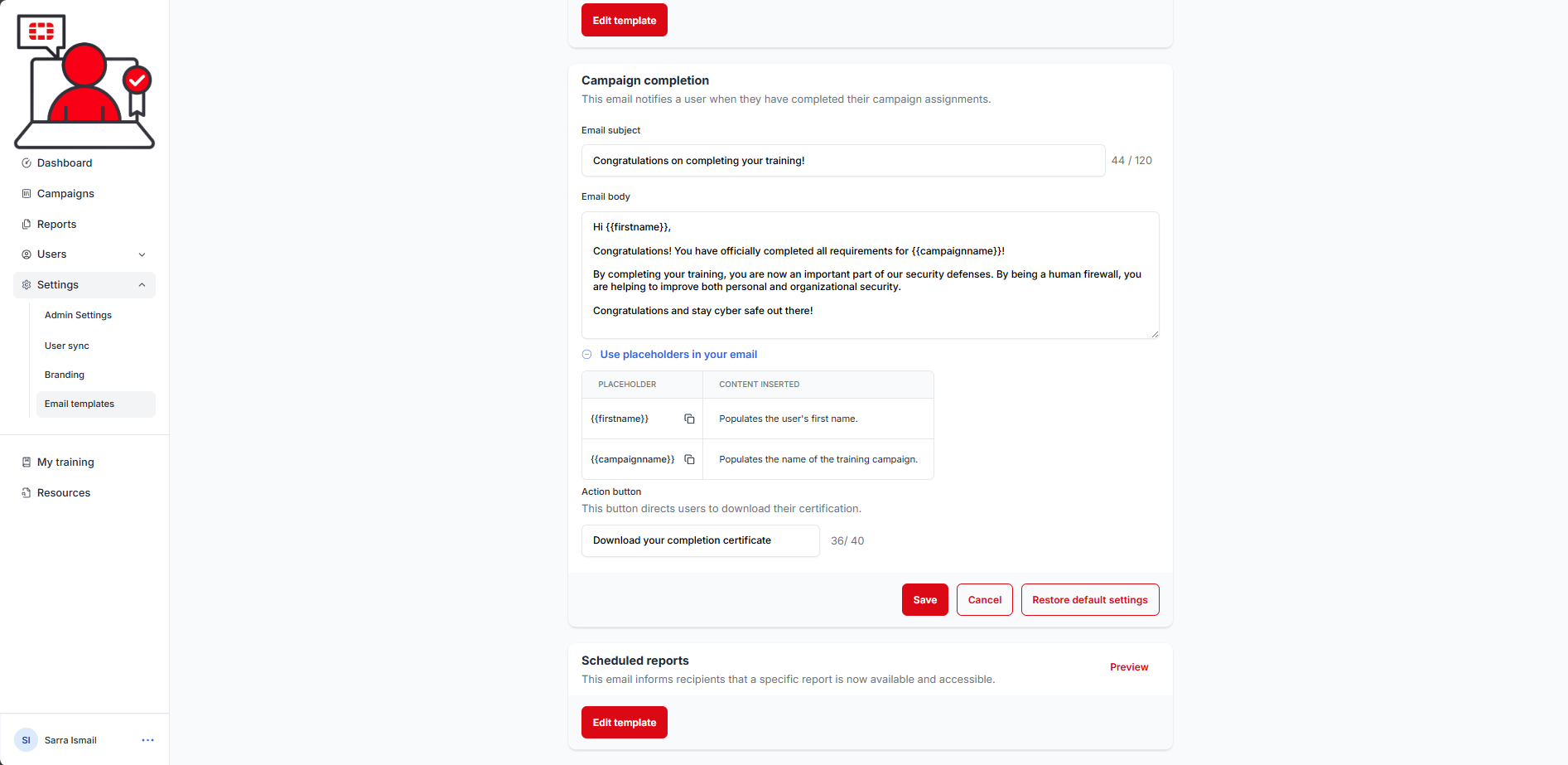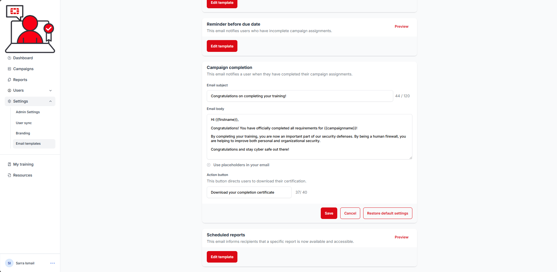 5.) Customize the Action button text as desired. This is the text that will appear on the button within the email that allows the learner to download a copy of their certificate of completion.