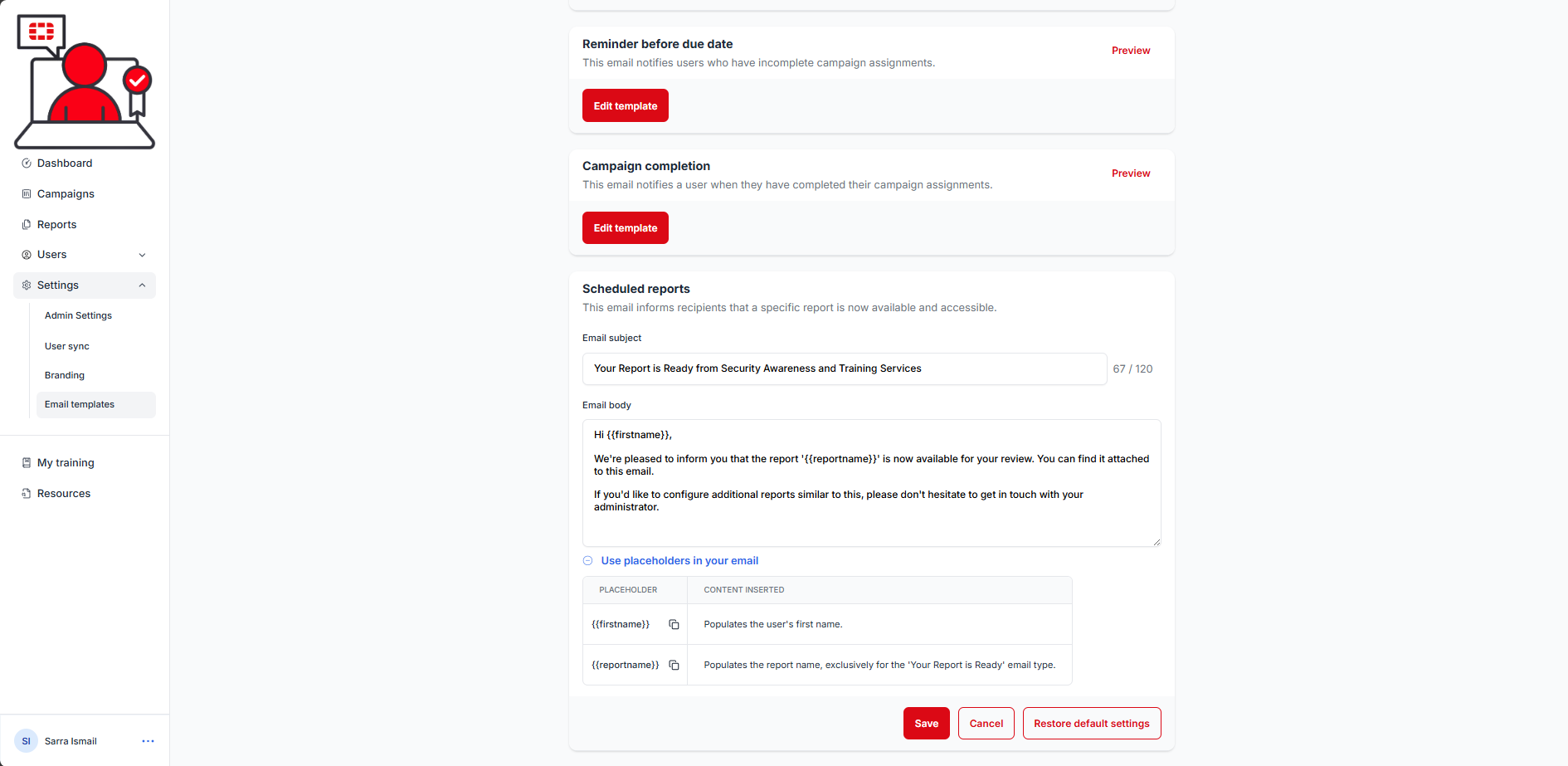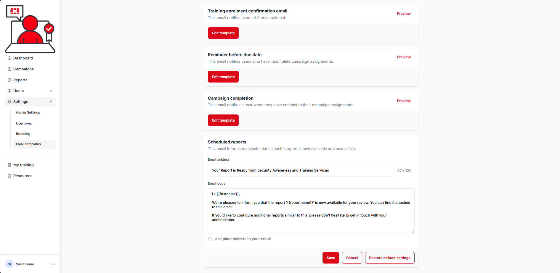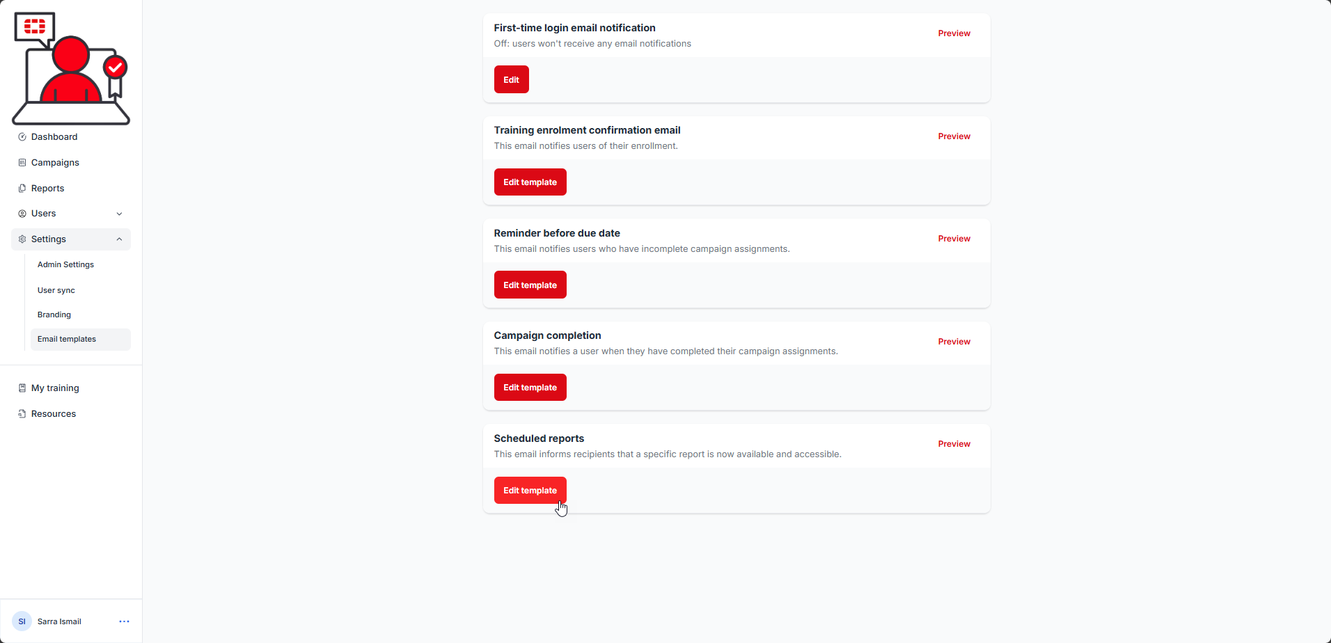 1.) Select Settings from the navigation menu, then select the Email templates tab. The Email templates page is displayed:
