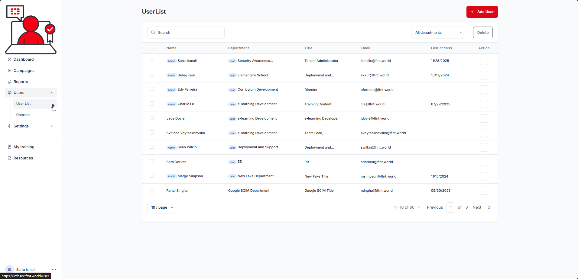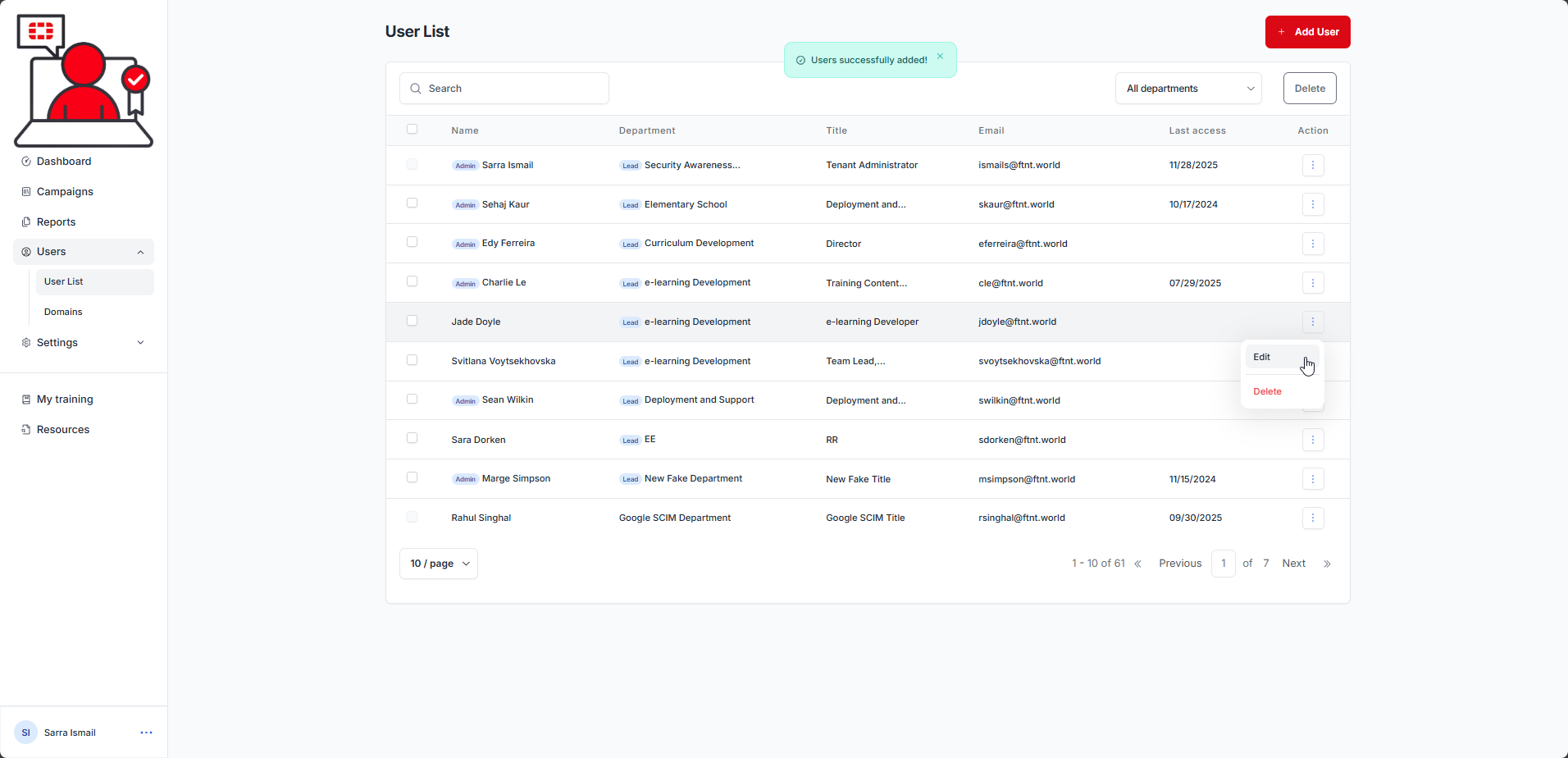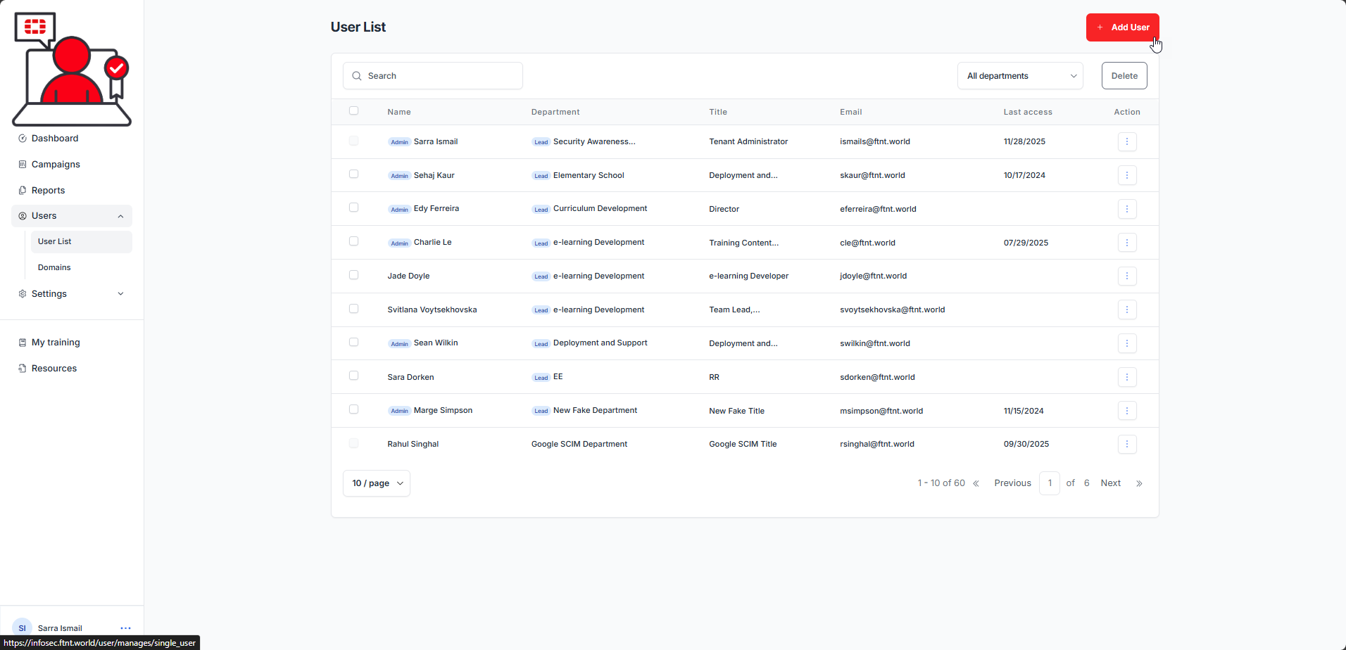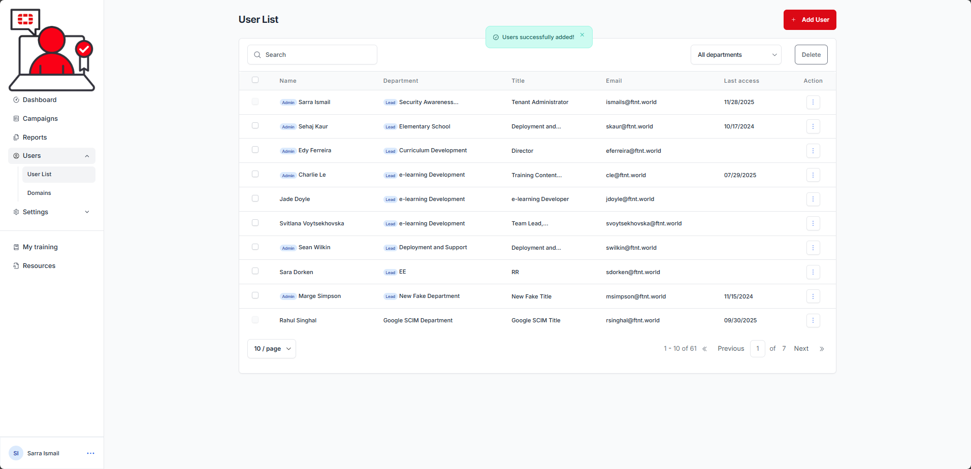 Is this user a department lead? | Default: No. If yes, user will be selectable when scheduling management level campaign reports. They will receive statistics for any users who match their assigned department value. These reports provide the overall progress of the campaign (Completed, In Progress, Not Started, Overdue statistics) for the campaign. It does not provide learner information (names or emails). |