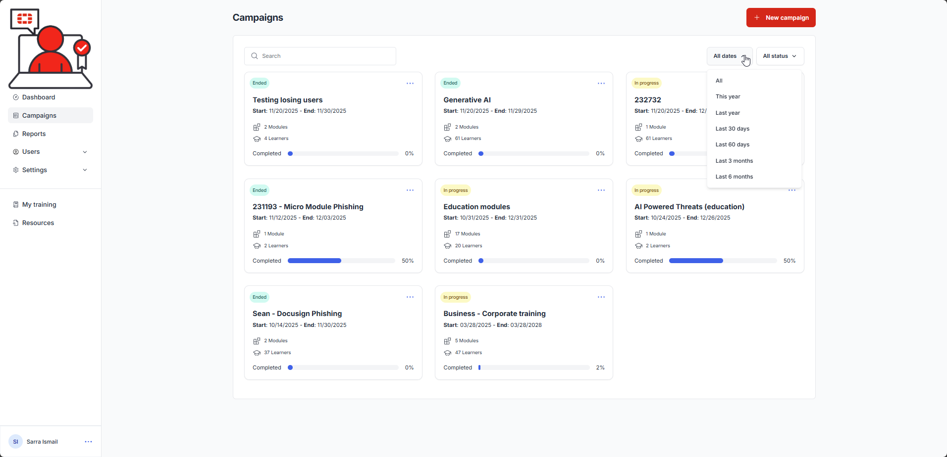 By default, this page will list all campaigns by default. You can search by name of a campaign and also filter the views by Dates or Status or by a combination of using both filters: