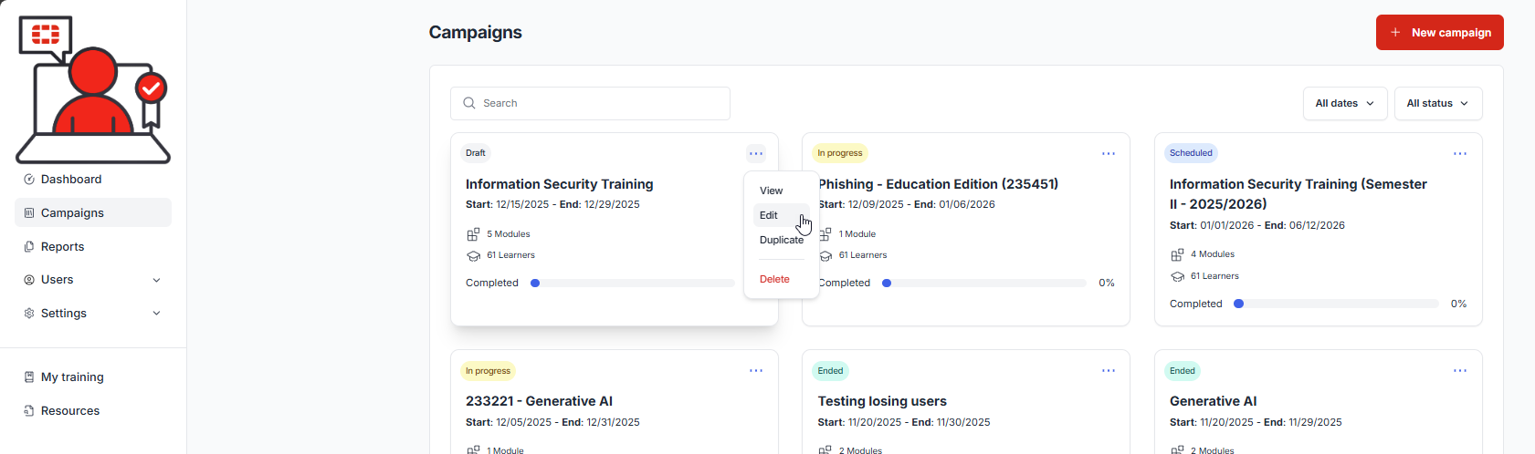 Administrators can edit campaigns from the Campaigns page. The status of the campaign (In progress, Draft, Scheduled, Ended) will dictate what can be editited.