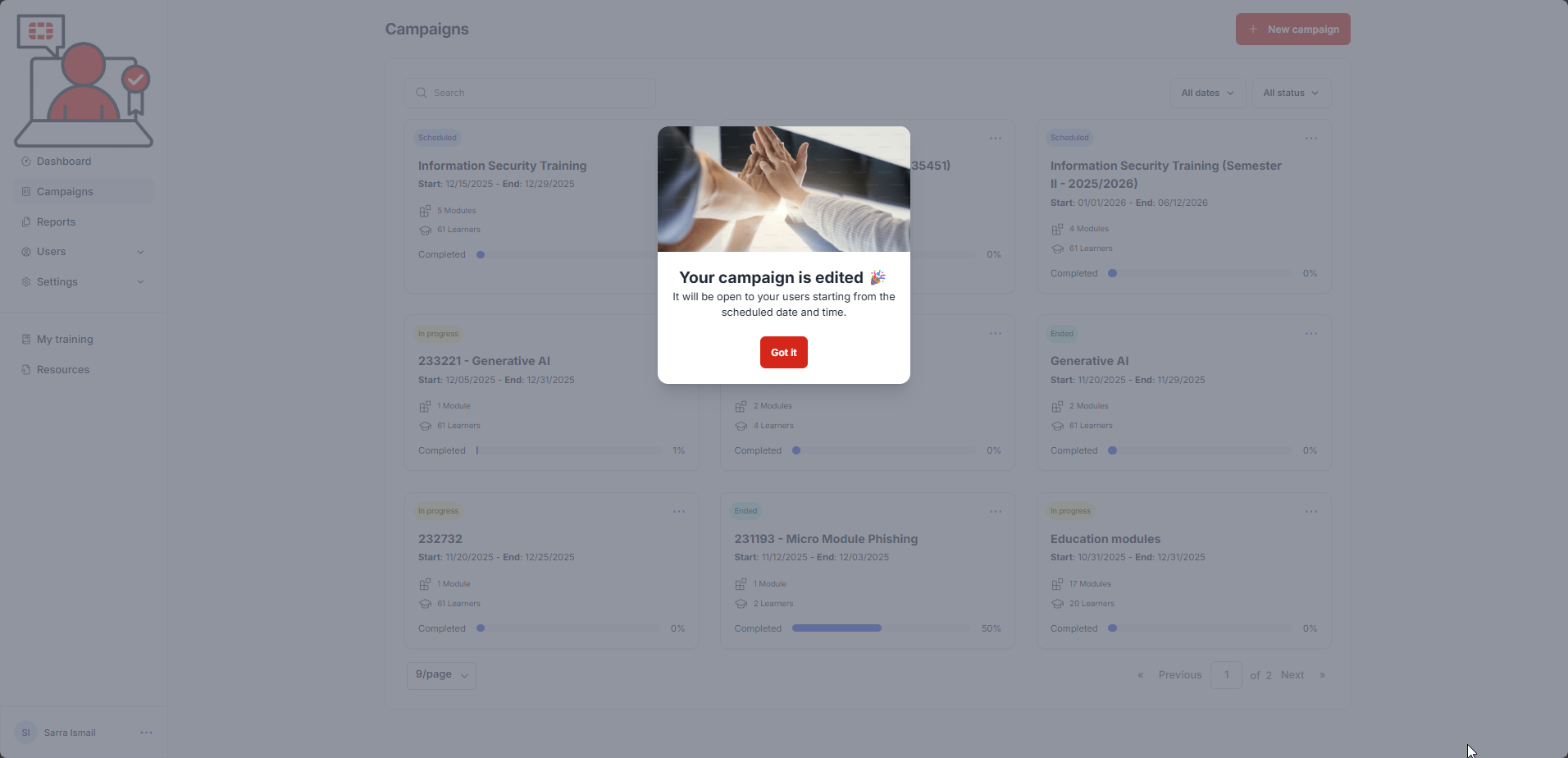 | Depending on where you are in the lifecycle of the campaign, you may not be able to modify certain values. For example, you cannot change the content after a campaign is launched. You cannot change dates if the date is already passed (i.e. start date, learner due date, end date). |