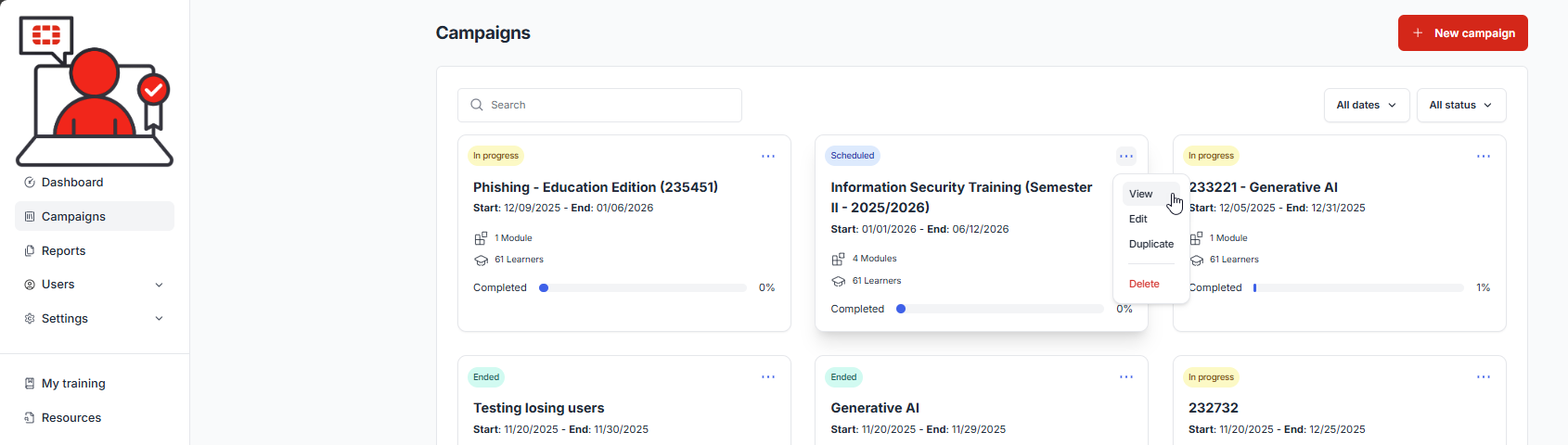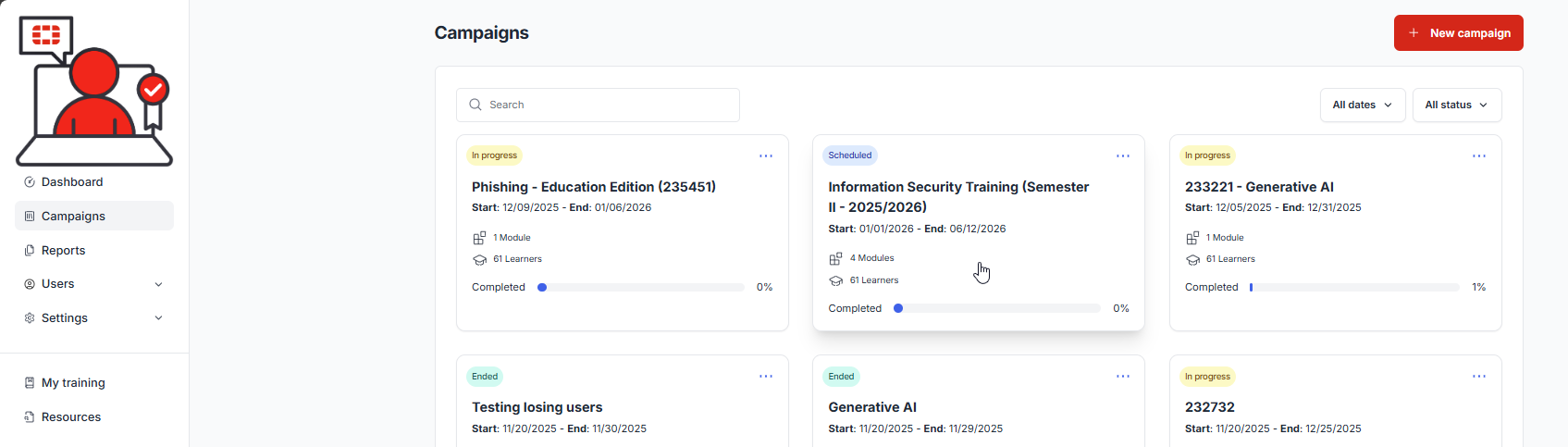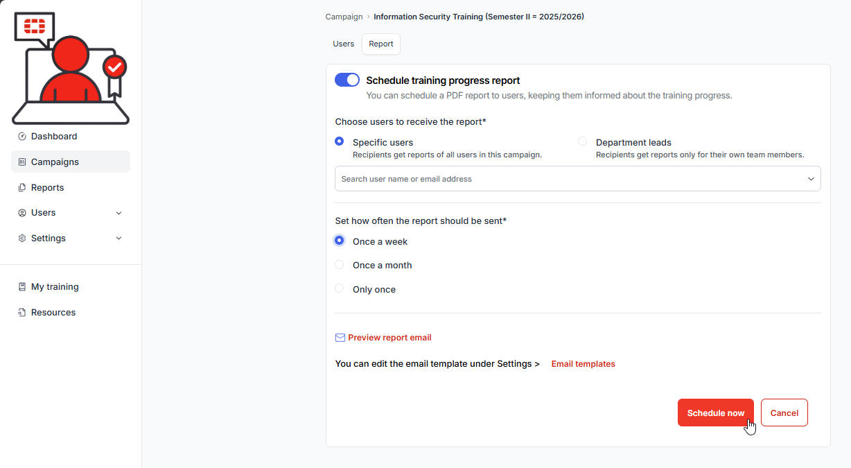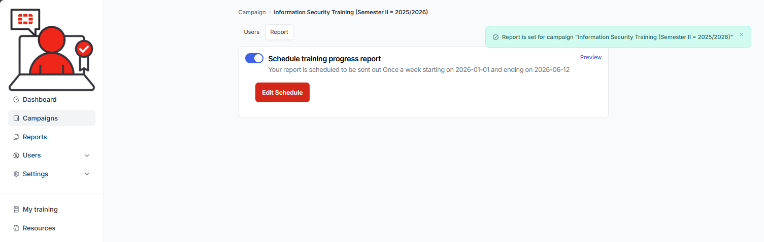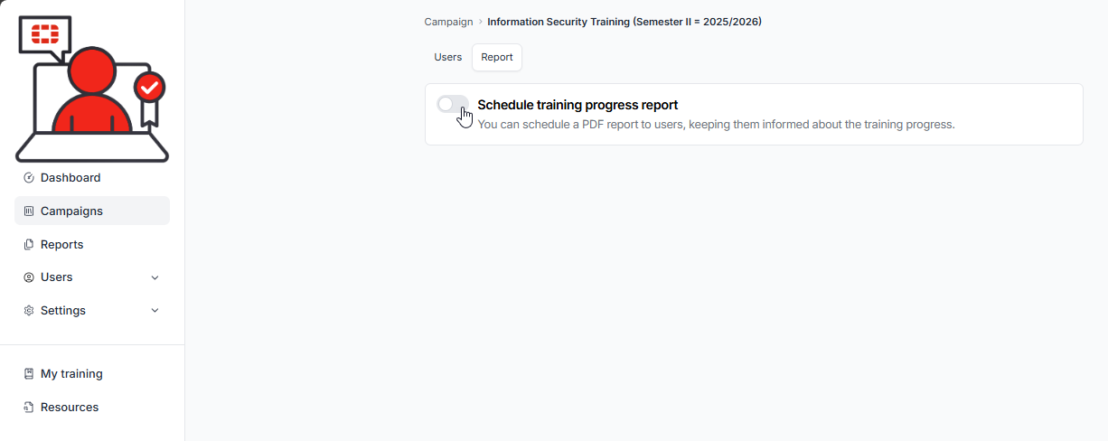 Administrators have the option to create and schedule training progress reports. These reports are high level and do not contain learner status’, however, they do give a high level overview of the progress of a campaign. For detailed reports, see: Reports