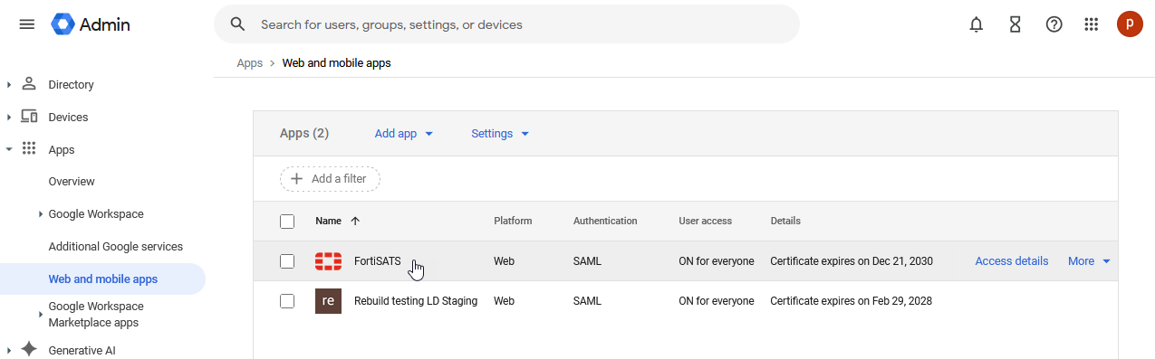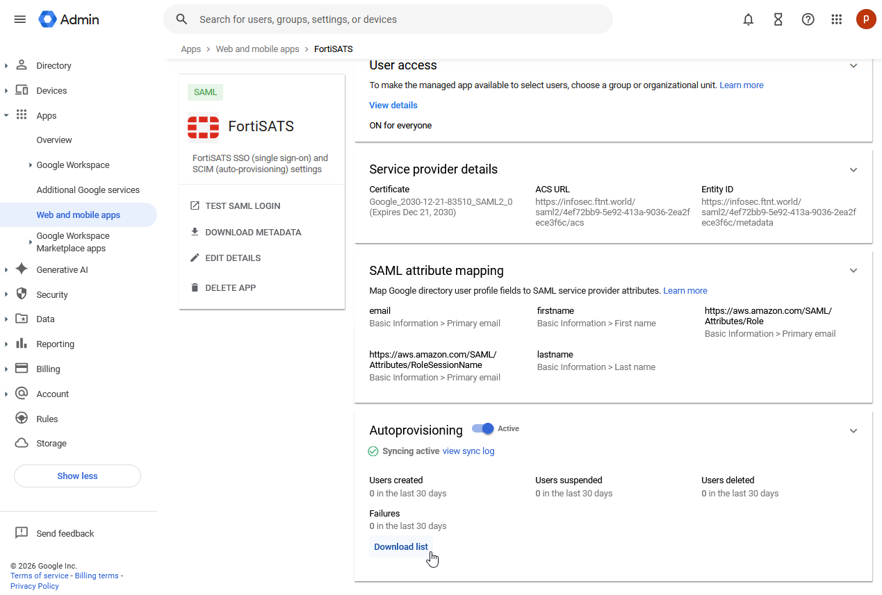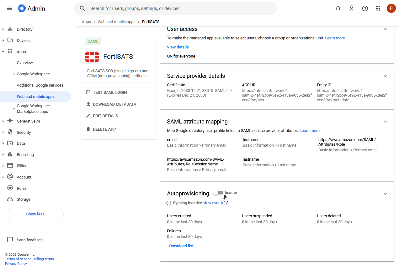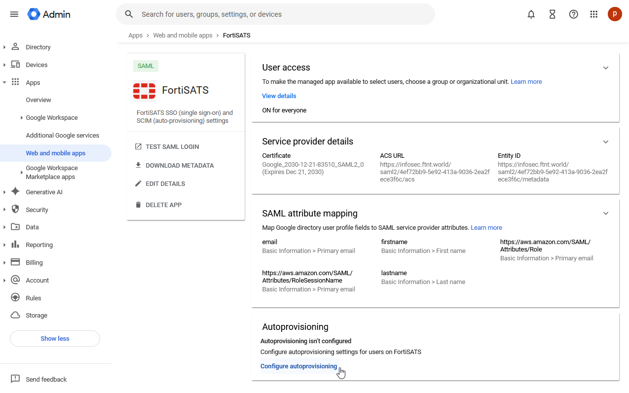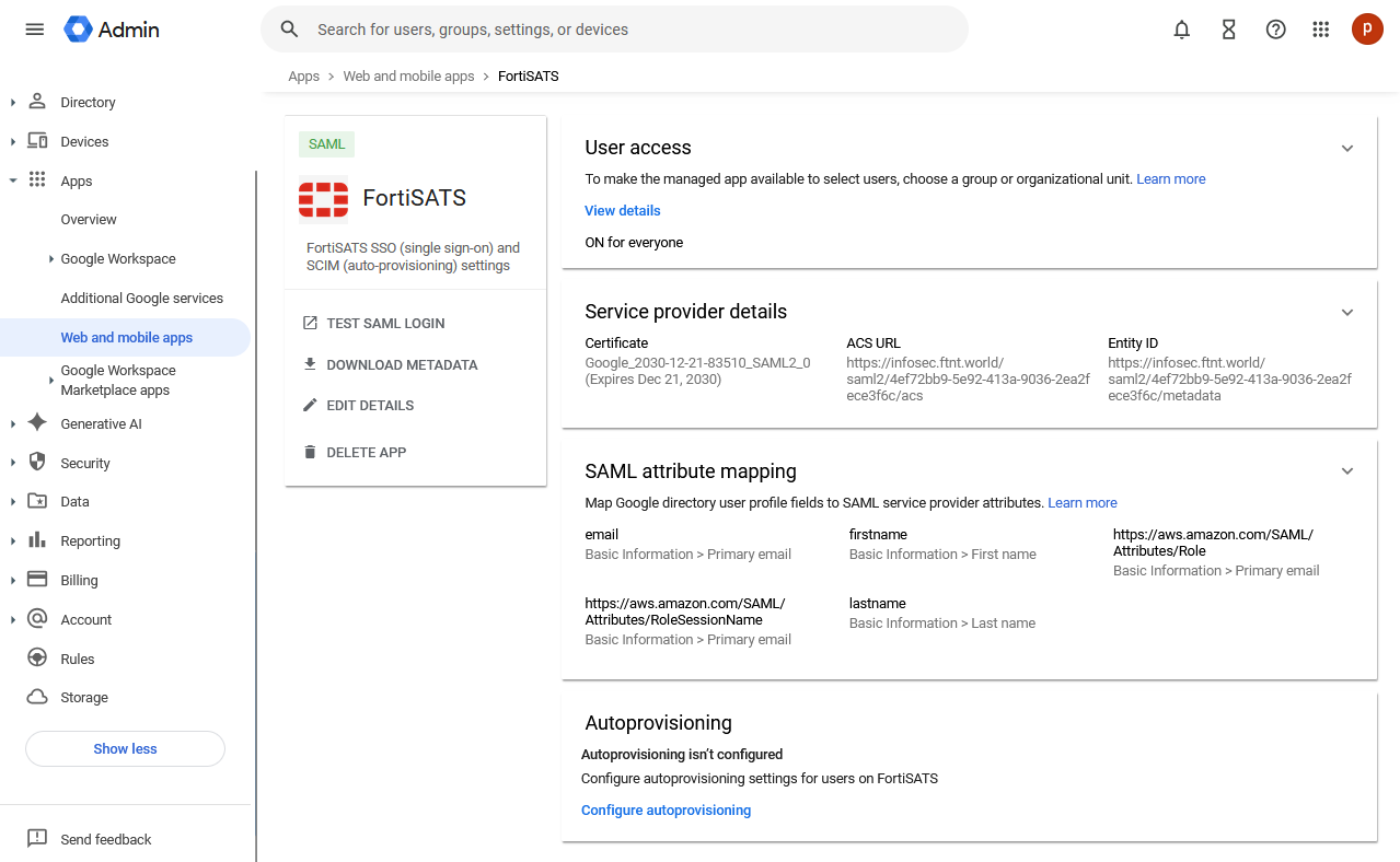 | These steps must be performed after configuring the SAML2 SSO application for authentication of users. You will need to be logged in to the Google Workspace Admin console as the administrator. You will also need to be logged in to the FortiSATS Admin console as the tenant administrator. To configure SAML2 SSO for Google Workspace, refer to this article: (V3.x) How do I Configure SAML2 Single Sign-on (Authentication) to use Google Workspace SSO? |