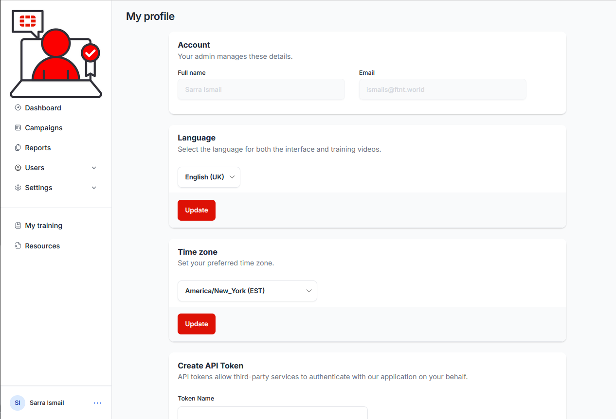 To obtain the access token for App authorization, you must log in to the Security Awareness and Training Service as the tenant administrator. (This is the account that logs in to initialize the service and manage licenses from https://support.fortinet.com).