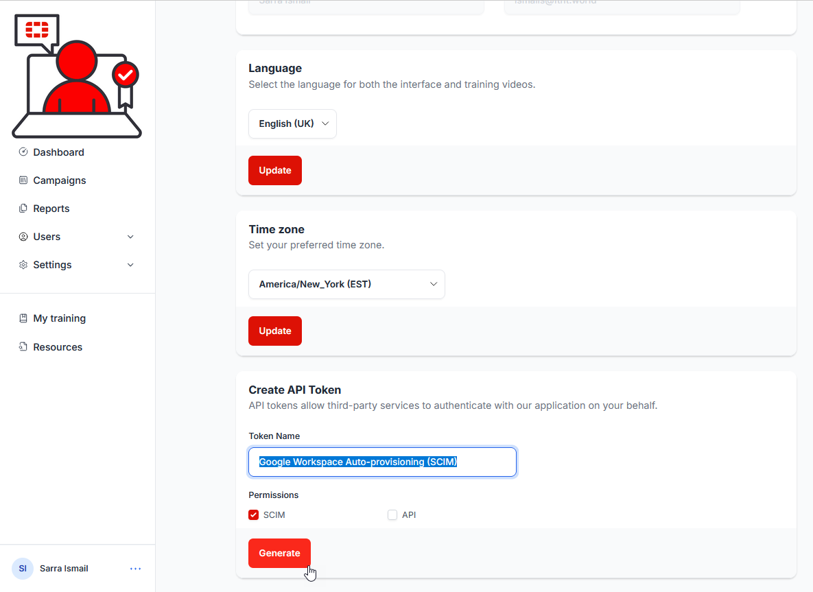 13) In the Create API Token section, give the token a meaningful name (e.g. Google Workspace auto-provisioning (SCIM)), ensure that the SCIM permission checkbox is checked, and select the Generate button: