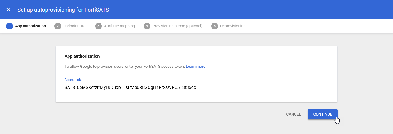 15) Return to the Google Workspace admin console and paste the token into the App authorization token field in Google Workspace and select CONTINUE: