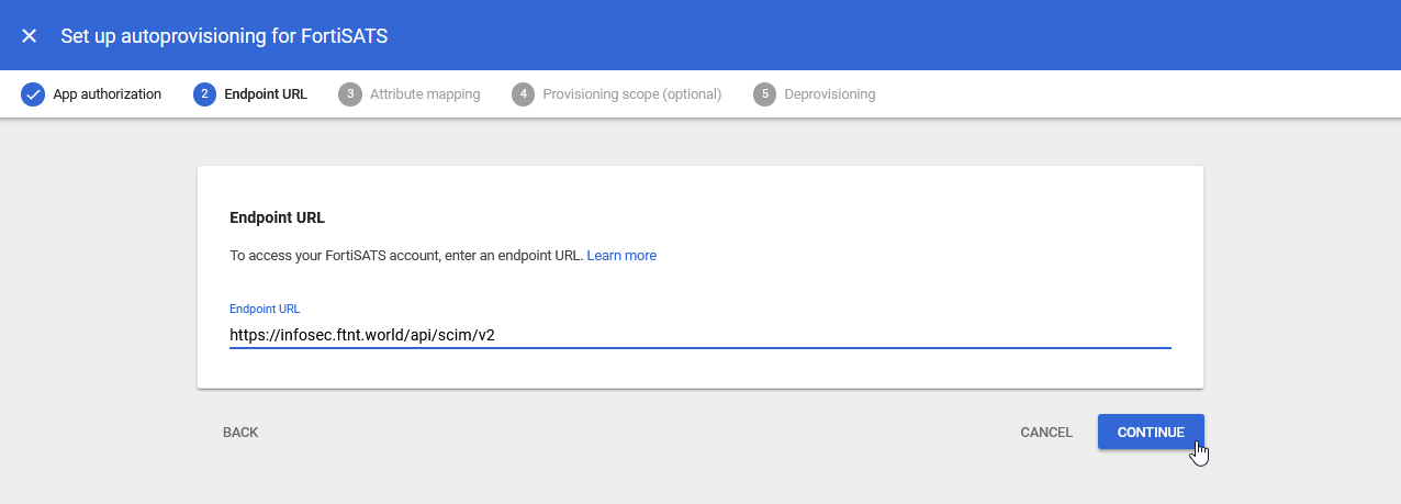19) Return to the Endpoint URL page in Google Workspace and paste the url into the Endpoint URL field and select CONTINUE: