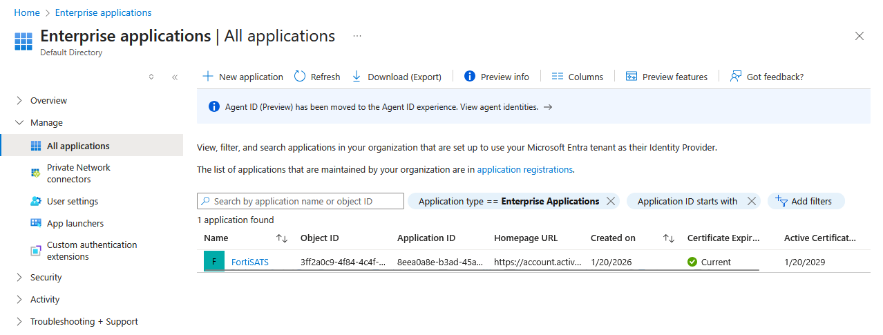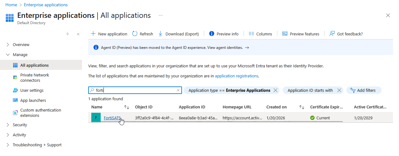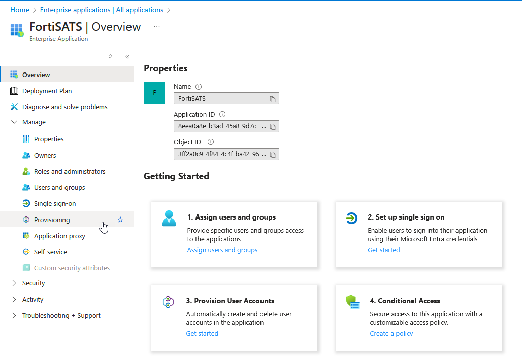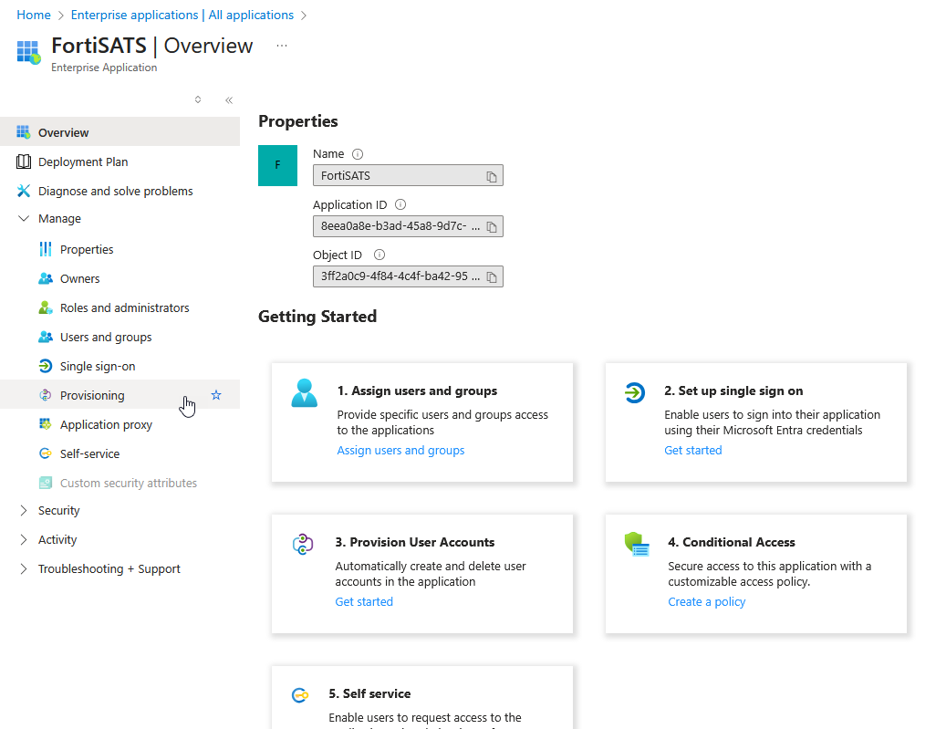 | These steps must be performed in addition to configuring the SAML2 SSO application for authentication of users. You will need to be logged in to the Entra/Azure/O365 Admin console as the administrator. You will also need to be logged in to the FortiSATS Admin console as the tenant administrator. To configure SAML2 SSO for Microsoft, refer to this article: (V3.x) How do I Configure SAML2 Single Sign-on (Authentication) to use Azure AD SSO? |