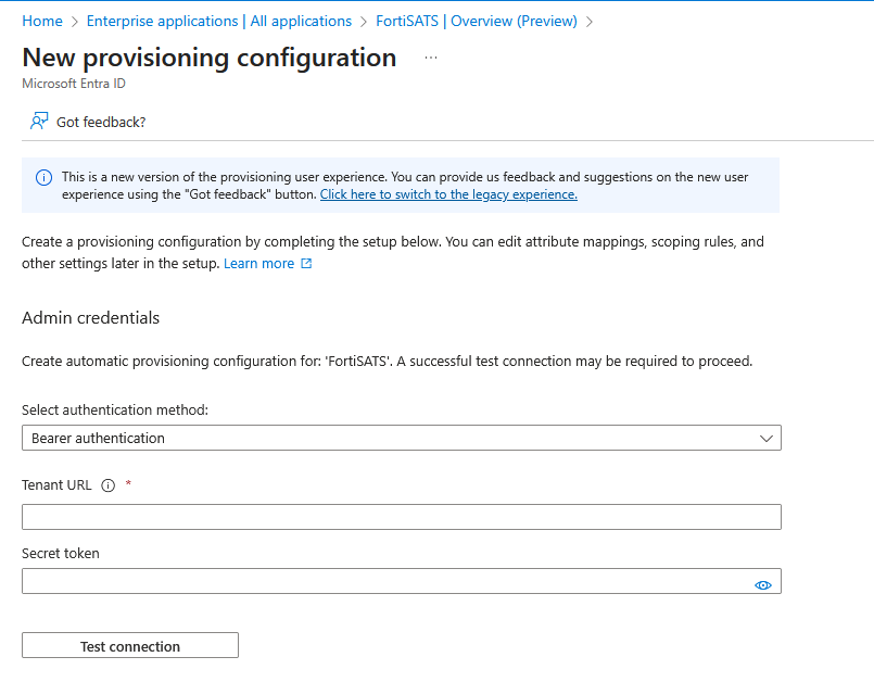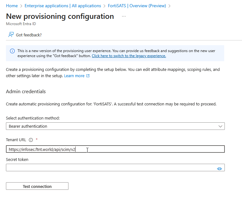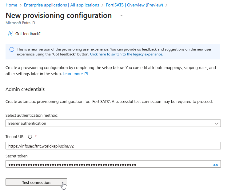 15) Paste the token into the Secret token field in the Microsoft Entra admin and then select the Test Connection button to ensure the credentials are accepted: