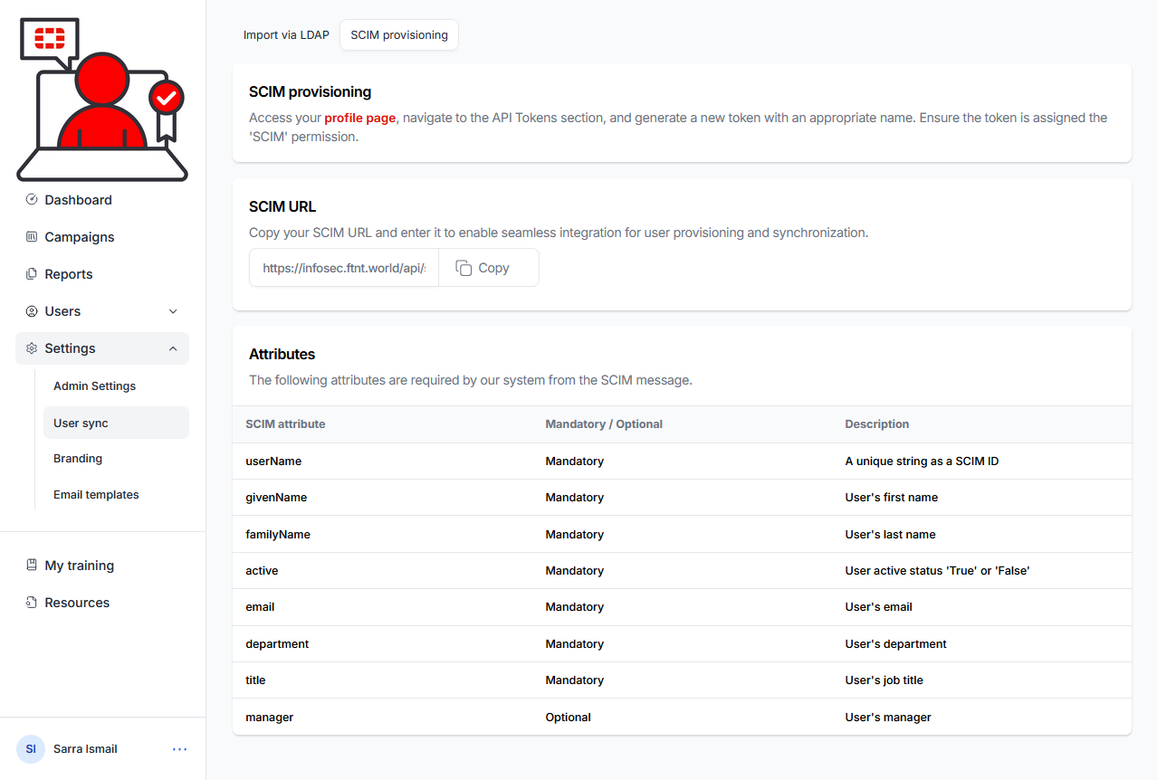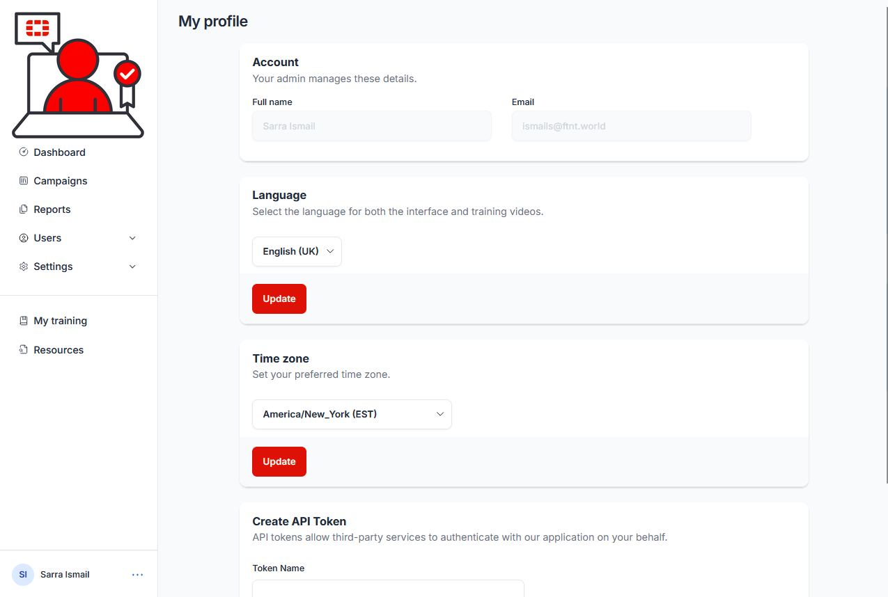 12.) From the Security Awareness and Training Service admin console, Select My profile from the user menu in the lower left corner of the service interface: