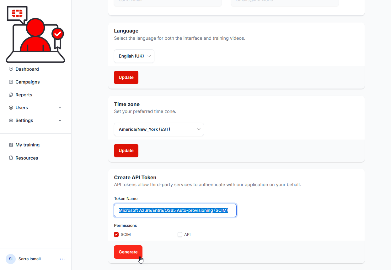 13) In the Create API Token section, give the token a meaningful name (e.g. Microsoft Azure/Entra/O365 Auto-provisioning (SCIM) ), ensure that the SCIM permission checkbox is checked, and select the Generate button: