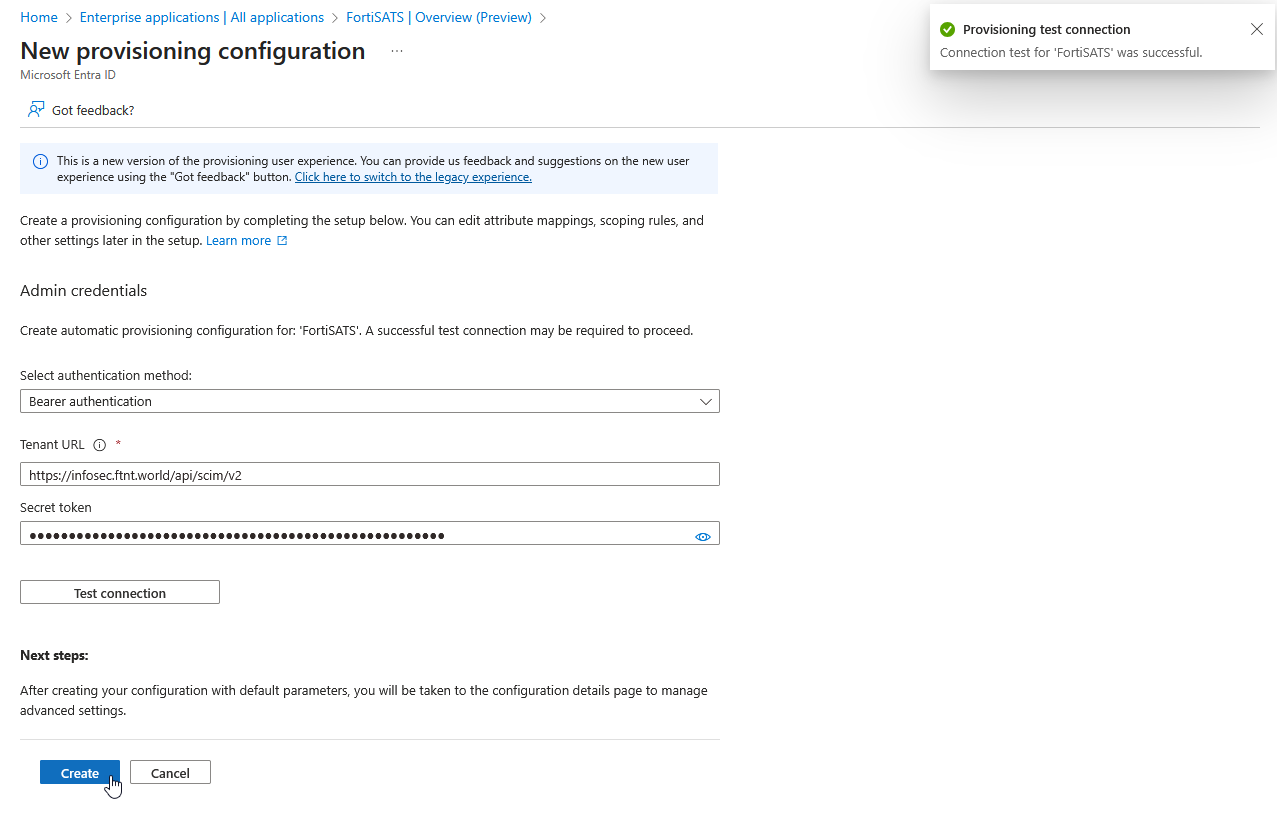 16.) If the test succeeds, you will receive a confirmation in the upper right-hand corner. Select the Create button in the lower left-hand side of the New provisioning configuration screen: