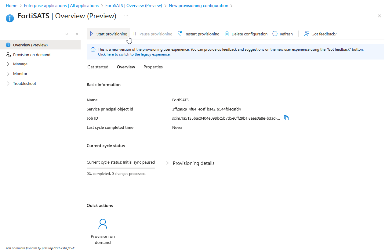 17) Once created, select the Start provisioning button in the upper left-hand quadrant of the right-hand pane (and confirm the action in the Start provisioning pop-up):