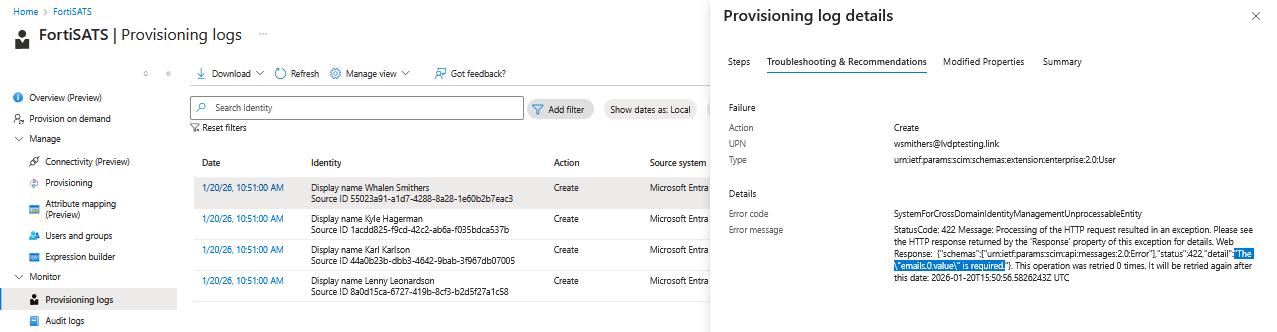 | It may take up to 40 minutes for users to start showing up in the service. You can test with a single user by using the Provision on demand quick action (see above screenshot). All user data is pushed from the Azure LDAP server based on the configuration settings and attribute mappings. If a user entry does not contain of the mandatory attributes, the user will be skipped. The only information Fortinet provides is the url and token. If users are missing or not synching, check the attributes and the Microsoft auto-provisioning logs. |